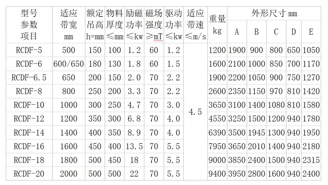 RCDF系列油冷自卸式电磁除铁器主要技术参数: